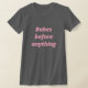 Faça uma declaração com esta "Bebês Antes de Qualquer Coisa"—uma design ousada e poderosa para aqueles que priorizam a confiança, amizade e amor próprio. Apresentando uma paleta de cores única e inspirada por retrorreflectores e uma tipografia atraente, esta camisa é perfeita para qualquer pessoa que ame estética vibrante e energia destemida. Quer você o estime por uma noite fora, um dia casual, ou uma celebração de Galentine, isso é sobre abraçar seu poder da forma mais indesculpável