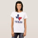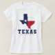Texas, Estado da Estrela Solitária com design de mapa da bandeira feminino camiseta branca. Este design apresenta a palavra "Texas" em texto azul e vermelho com o mapa do estado preenchido com a bandeira do Texas. Use esta camiseta para mostrar que você é patriota e orgulhoso de ser do Texas ou para dar como presente a qualquer texano.