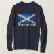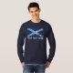 Texto de Scotland + T-shirt escocês da bandeira do Grunge. A bandeira de Scotland é azul com cruz de um St Andrew branco. Scotland chamou Alba no gaélico escocês é uma parte do Reino Unido na ilha de Grâ Bretanha. Este produto pode facilmente ser personalizado e está disponível em outros produtos demasiado.