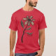 Camisa gótica personalizada com um desenho de tinta de uma estranha flor escura com folhas negras agudas com veias brancas e pétalas brancas sobre fundo vermelho vibrante no estilo de retrô-safra.