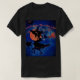 A bruxa do Dia das Bruxas cavalgando sua vassoura com a lua laranja do Dia das Bruxas e o gato preto e o texto. O fundo azul escuro do céu na camisa preta.