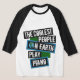 This design features a bold, distressed, messy-style font with the text "The Coolest People on Earth Play Piano" prominently displayed. A standout element is the blue and green globe, layered over matching color blocks, adding vibrant visual appeal. The earth element represents a global appreciation for music, resonating with its traditional yet cool vibe. The design is suited to piano players and enthusiasts alike, as it celebrates their unique passion with a fun, eye-catching statement.