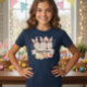 This charming Kids Basic T-Shirt is perfect for your girl's Easter celebrations! The adorable graphic features three cute, watercolor-style bunnies nestled behind a banner that says "Happy Easter". The design is beautifully finished with colorful Easter eggs و delicate flowers. The navy blue background makes the pastel colors pop. This comfortable tee is an excellent choice for pre-teens and young girls (ages 10-14) for any spring or holiday event.