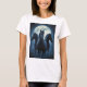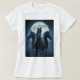 Three majestic black horses standing proudly under the glow of a full moon. The scene is bathed in a mysterious, blue-tinged light, and the low grasses in the foreground add to the wildness and natural feel. The horses have white markings on their foreheads, which contrast sharply with their dark coats.