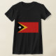 Bandeira de Timor-Leste. A bandeira de Timor Leste foi adotada em 2002. É o mesmo que a bandeira de 1975. À meia-noite do dia 19 de maio, e durante os primeiros momentos do Dia da Independência, 20 de maio de 2002, a bandeira das Nações Unidas foi derrubada e a bandeira de um Timor-Leste independente foi erguida. De acordo com a Constituição da República Democrática de Timor Leste, Parte I, Seção 15: "A bandeira nacional é retangular e é formada por dois triângulos isósceles, cujas bases se sobrepõem. Um triângulo é preto e sua altura é igual a um terço do comprimento sobreposto ao triângulo amarelo, cuja altura é igual a metade do comprimento do sinalizador. No centro do triângulo negro há uma estrela branca de cinco pontas, o que significa a luz que guia. A estrela branca tem uma das pontas viradas em direção à extremidade esquerda da bandeira. A parte restante da bandeira é vermelha.".
