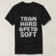 Bold black tee with white block text and paw prints saying Train Hard Pet Soft. High-contrast typography blends gym energy with pet-love charm for trainers, dog/cat owners, and casual wear.