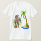 Camiseta básica de Bella branca, de Canvas branca, com a imagem de um pirata de cartoon de pernas rasteiras com o pé sobre um tesouro e um papagaio no braço. Ao seu lado está uma imagem de desenho de uma ilha deserta com palmeira e cocos. Veja toda a coleção de Roupa de naufrágio nos TOUCHES ESPECIAIS | Seção Favoritos para festas.