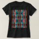 Um padrão vertical e simétrico de azulejo, inspirado nos estilos de design de arte mediterrânico e sudoeste, é composto por linhas de formas geométricas em coral e uma laranja ferrugem profunda com turquesa. Foto aqui em uma t-shirt preta, com outras cores e estilos disponíveis. Este é um design brilhante e colorido, polido, que oferece uma adição calorosa para o seu roupa casual do dia a dia (seja para o trabalho/escola, esportes/recreação, relaxamento/socialização ou apenas tarefas de execução). Esta camisa de "arte arável" pode iluminar a monotonia de vestir para nosso mundo mais casualmente cansado, e contribui para um sentimento de estilo personalizado.