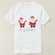 Double the holiday joy with this charming graphic featuring two cheerful Santa Claus characters. This delightful cartoon illustration showcases a pair of friendly Santas positioned against a stark black backdrop. The first Santa is exuberantly raising his arms in a gesture of pure joy and celebration, while the second offers a warm, friendly wave. Both figures feature the classic red outfit, a fluffy white beard, the iconic red Santa hat, and a minimalist design enhanced by black stripes. Their welcoming stances and cheerful expressions perfectly capture the spirit of Christmas. This clean, simple, and high-impact design is ideal for Print-on-Demand merchandise, including t-shirts, festive apparel, holiday greeting cards, and social media posts, guaranteed to spread holiday cheer and attract festive buyers. An excellent choice for a playful and modern Christmas design.