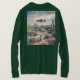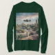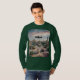 Esta é uma camiseta digital UFO Desert Flowers. A foto digital foi criada com arte gerativa. A foto apresenta uma paisagem desértica com plantas, cactos e flores. O céu tem nuvens macios. Uma nave espacial está pairando no centro. Há um gato bonito com um colar verde na frente. A camiseta é uma camiseta verde comprida masculina. A imagem está na frente e atrás da camiseta.