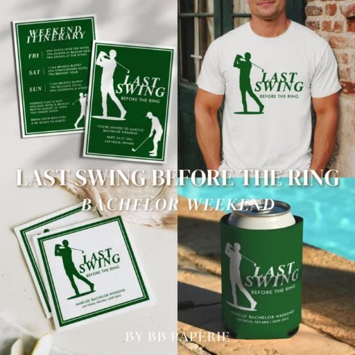 A suíte Last Swing Before the Ring é uma coleção refinada e inspirada no golfe para o fim de semana de solteiro, que combina charme clássico com um toque de espírito divertido. Com a silhueta de um golfista ousado em verde profundo e branco crocante, essa coleção apresenta o design perfeito para uma celebração sofisticada no campo. Com linhas limpas, estilo atlético e tipografia atemporal, essa suíte é feita para noivos que preferem trocar votos depois de uma última rodada com os amigos.
