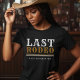 Celebre a última cavalgada dos noivos com esta camisa western da festa de despedida de solteiro(a). Com um texto estiloso inspirado em salões e uma paleta de cores marrom, preto e branco, é uma escolha divertida para uma noite fora ou fim de semana. Personalize com o nome da noiva ou do noivo e detalhes do evento para um presente personalizado!