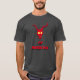 Um crânio vermelho com chifre com sombra preta sobre fundo preto em um T-Shirt com o texto Fy Rheolwor sob o crânio que pode ser traduzido para Meu Chefe.