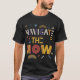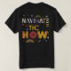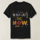 Um design de camiseta com o texto "Navegar no Agora." em letras negrito e geométricas, colocado contra um pano de fundo de formas e linhas coloridas.