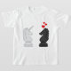 Unicórnios são a lenda, mesmo no mundo do xadrez. O cavaleiro escuro vê o que ele quer - um anjo branco com saliência - e nada o impedirá agora. Uma peça de xadrez de cavaleiro preto mostra afeto, na forma de corações vermelhos ascensões, em direção a uma peça de xadrez de unicórnio branco-marfim. Uma camiseta original de xadrez intelectual para jogadores, amantes e sonhadores.