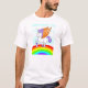 Unicórnio branco com aterragem roxa da juba e da cauda em um arco-íris nas nuvens. Design do t-shirt das meninas.
