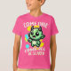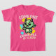 O gráfico mostra uma bela criatura verde com olhos grandes e brilhantes e pequenos chifres, sorrindo. O fundo colorido tem salpicos amarelos e azuis. O texto "Venha, venha todos, tenha medo" acrescenta um toque lúgubre, mas estranho. Cores: preto, branco, laranja, verde.