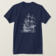 Design do t-shirt que caracteriza uma ilustração monocromática branca de um veleiro antigo no mar.