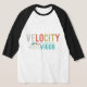 A t-shirt apresenta um design dinâmico com o texto "Velocity Meets Vigor" numa apresentação multicor. Cada palavra poderia ser uma cor vibrante diferente, ou as próprias letras poderiam ser um gradiente ou mistura de múltiplas matizes, criando um sentido de movimento e energia