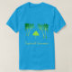 Mosaico, desenho gráfico, de uma ilha, com coqueiros, e cabana, mostrada com a frase "Verão Tropical" - em cores múltiplas, tons de verde, amarelo, marrom e azul.