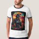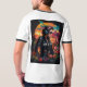 Uma mulher nua em uma jaqueta de couro e fones de ouvido se posiciona cercada por flores vibrantes, colocadas contra uma faixa do sol brilhando. Laranjas quentes e vermelhos se misturam com legal azuis, criando uma atmosfera artística moderna que captura um momento de calma introspectiva em meio à energia urbana.