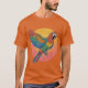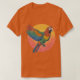 Esta design de camiseta maravilhosa apresenta um papagaio maravilhosamente detalhado em voo de médio, suas penas vibrantes se espalhando contra um pano de fundo de um nascer do sol radiante. A plumagem do papagaio mostra um espectro de cores, incluindo verdes vívidos, azuis ousados, vermelhos ferozes e amarelos ensolarados, criando um contraste dinâmico e atraente. O fundo consiste em um gradiente de matizes quentes de amarelo a rosa, com linhas radiantes que aumentam o sentido de movimento e energia. Esta design é perfeita para amantes da natureza, entusiastas de aves, e para qualquer um que aprecie a beleza da vida selvagem tropical.