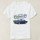 Esta é uma renderização de um carro musical clássico americano azul de 1967 com gráficos de estilo vintage em segundo plano para um olhar retrô.