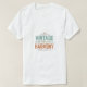 A camiseta apresenta um design que evoca um sentido de paz e unidade de uma era passada. O texto "Vintage Harmony" é exibido em caracteres fluentes, ligeiramente decorativos, que lembram velhas folhas de música ou rótulos de gravação antigos. Cada letra é uma cor quente diferente de uma paleta antiga, criando uma sensação de encanto nostálgico. Imaginem cores como laranjas mudas, amarelos queimados e chaleiras profundas, com sotaque de verde-oliva desbotado ou burgundy. O efeito geral é visualmente interessante e cheio de calor, capturando a essência da harmonia de safra.