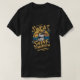 This vintage-style illustration features a confident rabbit in a fedora standing before a retro sunset with bold motivational text that reads “Sweat Today Shine Tomorrow.” The design blends classic workout vibes with a playful twist, highlighted by warm yellow tones and subtle gear accents. Perfect for fitness lovers, retro art fans, and anyone who enjoys unique motivational animal themes.