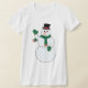 Uma das coisas legal sobre o inverno é ser capaz de fazer um boneco de neve. Esta design é de um boneco de neve particularmente bom. Este boneco de neve está acenando e vestindo um cachecol verde e um chapéu preto. Este design de boneco de neve acenando parece excelente nesta t-shirt feminina. Perfeito para si mesmo ou como presente