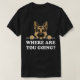 Funny Where Are You Going? design featuring a realistic German Shepherd peeking over a line with paws visible. Detailed dog illustration with natural colors, expressive face, and bold rounded typography in a clean, high-contrast layout.