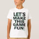 The T-shirt showcases a white and green line art drawing of a character that appears to be a robot or a stylized human figure. The character is depicted in a dynamic pose, with one arm extended forward and the other bent at the elbow. The design is overlaid on bold black text that reads "LET'S MAKE THIS GAME FUN!" The combination of the intricate line art and the eye-catching text creates a visually appealing and fun design.