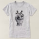 Camisa de mão bruxa com desenho de tinta representando uma mão no punho com unhas negras agudas e um anel preto com mau com dentes agudos. Uma ilustração assustadora e divertida com um sentimento gótico.