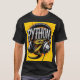 t shirt design, Create a menacing black t-shirt with a full-length Python motif inspired by the aesthetics of heavy metal music. The artwork features an elegant style, Golden and light green python coiled sinuously, its scales shining in the dim light. Python's mouth is wide open, revealing rows of sharp teeth dripping with blood, exuding a raw feeling, primitive aggression, bright sky and big sun in the background, improving the sinister atmosphere of the design. Python's eyes shine with a malevolent glow, capturing the essence of danger and violence. The overall style is bold and intense, embodying the dark and edgy spirit of heavy metal music.