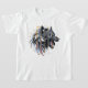 Imagem é uma ilustração digital que apresenta a cabeça de um lobo estilizado com uma expressão agressiva, mostrando dentes afiados e um olhar feroz. O pelo do lobo é representado em tons de preto, branco e cinza, com sotaques de ouro e vermelho, acrescentando um contraste dinâmico e vibrante.