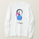 Esta camisa de maternidade das mulheres tem um fundo branco. O design inclui as cores enegrece, rosa e azul.