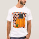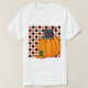 Camisetas coloridas do Halloween, canecas, cartões, adesivos, bolsas de truque ou de tratamento, ímanes e outras roupas e presentes do Halloween com um gato preto giro na abóbora e design de pontos cor laranja e preto!