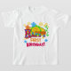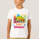 Camisetas de Primeiro Aniversário alegres, fatos-chave, cartas, autocolantes, sacos de tota e outros roupa de primeiro aniversário e presentes com um sorridente sol amarelo, flores e texto colorido.