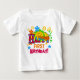 Camisetas de Primeiro Aniversário alegres, fatos-chave, cartas, autocolantes, sacos de tota e outros roupa de primeiro aniversário e presentes com um sorridente sol amarelo, flores e texto colorido.