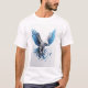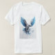A imagem mostra uma águia branca majestosa com sotaques azuis flagrantes, soprando pelo ar com suas asas estendidas. A águia parece estar quebrando uma barreira de gelo ou de cristais, acrescentando um senso de poder e determinação à design. A estética global é dinâmica e visualmente cativante, com uma mistura de detalhes realistas e elementos estilizados. A paleta de cores é impressionante, com o branco e o azul contrastando lindamente com o fundo da cinza.