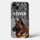 Uma capa de telefone Otterbox German shepherd. O design apresenta um padrão de camuflagem silenciosa com um cão German shepherd sobre um fundo texturizado.