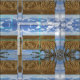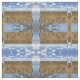 Duas fotografias tomadas durante a colheita do trigo combinaram junto para fazer um teste padrão natural incomum interessante do bloco para o tecido. Aperfeiçoe para travesseiros e os projetos home da decoração. O branco nubla-se contra o jogo do céu azul fora dos padrões lineares das fileiras amarelas e marrons do trigo.