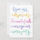 Lembre alguém que está lutando contra o câncer de mama de se lembrar de quem ela é com este design de tipografia de estilo de caligrafia único, apresentando esta mensagem em estilo colorido de aquarela: "Você é inspiradora, linda, corajosa, incrível." O "L" na palavra linda é uma fita rosa de câncer de mama.