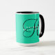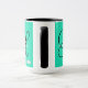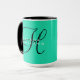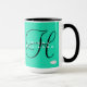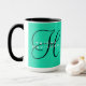 Uma caneca de café verde com seu nome em branco e inicial em preto. As cores podem ser alteradas escolhendo as opções personalizar e personalizar. Design HAMbyWhiteGlove aka HAMbWG.