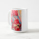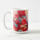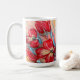 As xícaras retratam flores vermelhas vibrantes colocadas sobre um fundo abstrato, de cor clara. As flores, com suas pétalas vermelhas ousadas, destacam-se com destaque, acrescentando um senso de calor e intensidade ao trabalho de arte. O fundo é uma mistura suave de tons leves, talvez bege, creme ou tons pastéis, criando uma atmosfera calmante e serena. A abstrato do fundo contrasta com as flores detalhadas, fazer-as como ponto focal da pintura