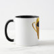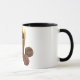 Essa imagem mostra uma caneca de cerâmica branca com interior e alça pretos, apresentando um impressão na moda de uma xícara de café ouro cheia de cerveja escura, acompanhada de dois grãos de café realistas. O elegante e minimalista design faz dele um presente perfeito para amantes de café ou como um complemento chique para qualquer cozinha ou escritório — ideal para apreciar seu fôlego matinal favorito no estilo.