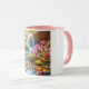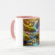 This 11 oz Combo Mug has color on the inside and on the handle, while the rest of the mug is white. An image of pink wildflowers blooming next to a mountain stream covers the front.