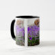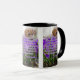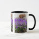 Esta caneca de dois tons apresenta um design que tem uma fonte Sans impressão com letras roxas coloridas contorno prateado mostrando o verso da bíblia "1 Corinthians 12:3" KJV sobre uma imagem mostrando um filhote fofo giro andando por um leito de flores roxas e pétalas verdes no fundo deste tema baseado na fé. Este verso está referindo o capítulo 12 do Livro de 1 Corinthians mostrando o terceiro verso neste tema de citação da bíblia do Rei James bíblia. A jante e o manípulo são vidrados em cores compatíveis, disponíveis em micro-ondas e máquinas de lavar louça de tamanho 11 onças ou 15 onças, construindo cerâmica segura.