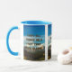 Esta caneca de dois tons tem a escritura de bíblia "1 de Salónica 5:21" KJV em uma impressão com letras escura e esverdeada com contorno verde escuro e citação de bíblia ouro sobre um quadro de fundo que ignora uma coleção de árvores verdes cercadas por grama verde mais clara com uma cordilheira na distância sob um céu azul nublado neste tema de citação bíblia da bíblia Rei James. A jante e o manípulo são vidrados em cores compatíveis, disponíveis em micro-ondas e máquinas de lavar louça de tamanho 11 onças ou 15 onças, construindo cerâmica segura.