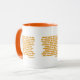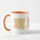 Esta caneca de dois tons mostra um design que apresenta uma fonte impressão de Batalha Escarnecida com letras amarelas com contorno laranja que apresenta o verso da bíblia KJV "1 Timothy 1:9-10" sobre um fundo branco neste tema baseado na fé. Este verso está referindo o capítulo do Livro de 1 Timothy 1rua exibindo os versos 9 a 10 neste tema de citação da bíblia do Rei James bíblia. A jante e o manípulo são vidrados em cores compatíveis, disponíveis em micro-ondas e máquinas de lavar louça de tamanho 11 onças ou 15 onças, construindo cerâmica segura.